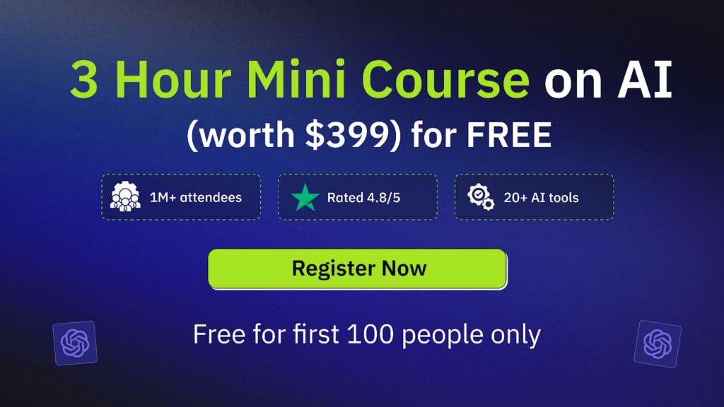 This free 3-hour Mini Course on AI & ChatGPT (worth $399) will help you become a master of 20+ AI tools & prompting techniques and save 16 hours/week.